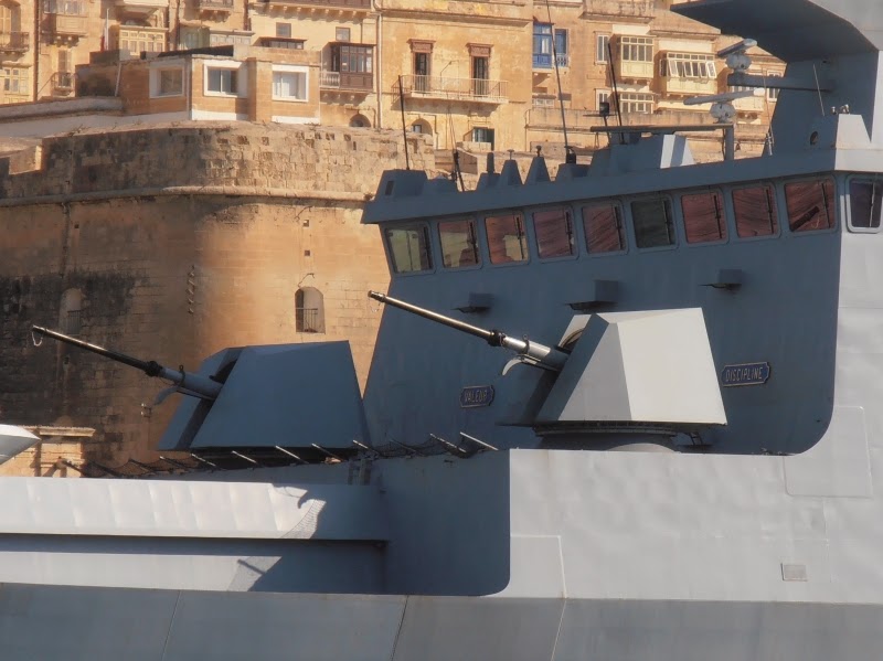 The French ships are armed with two 20mm/90cal modele F2 guns installed to port and to starboard. This gun has a firing rate of approximately 750 rounds per minute while the effective range against aerial targets is about 1,500-2,000m. The gun has two 150-cartridge boxes on each side of it. The gun is maneuvered by the body of the gunner, who is attached to the weapon directing the fire via an optical visor. The Italian ships have two OTO Melara Oerlikon KBA 25mm/80cal guns which are also installed one to port and one to starboard. The guns are stabilized, electric servo-drive assisted, while a weapon control is featured in order to allow the gunner to remain steady at any barrel elevation, laying the gun with the maximum accuracy even against targets at maximum elevation. A conventional aiming system is fitted to the mount, but also an IR sight with integrated ballistic reticule is available. The rate of fire is about 650 rounds per minute and the effective range for aerial targets is about 2,000m. The gun has two 126-round boxes on each side of it.