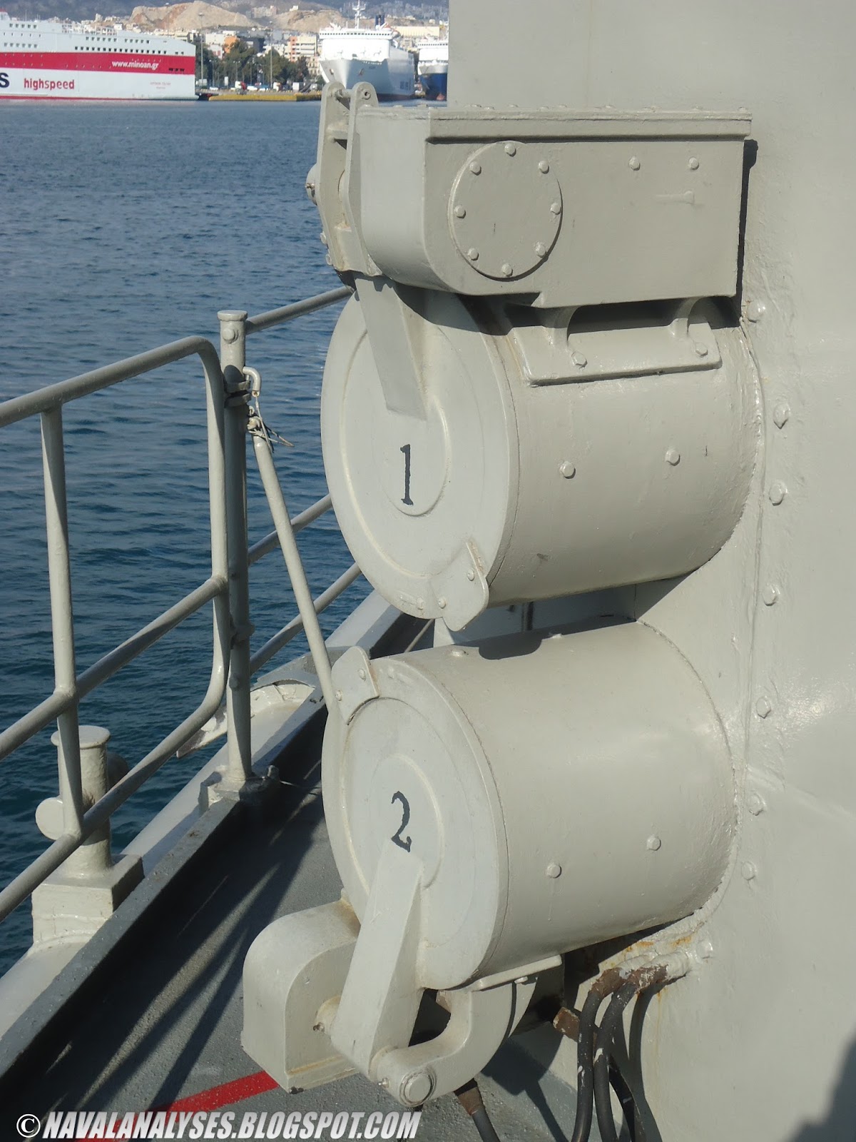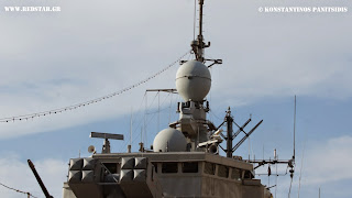 other frigates of the same type. Note that the new engines are of higher power and less weight than the old ones. More likely, one more ship of the class will receive the new electric engines in the future. Meanwhile, the frigate HS Aegeon and HS Navarinon have appeared with a new antenna on her mast. I assume that it is an omnidirectional UHF antenna, perhaps an R&S AD033V3 or something very similar. Moreover, all the non-modernized frigates of the class, have received the new electro-optical sensor MLT-TDR-10A made by Miltech Hellas.