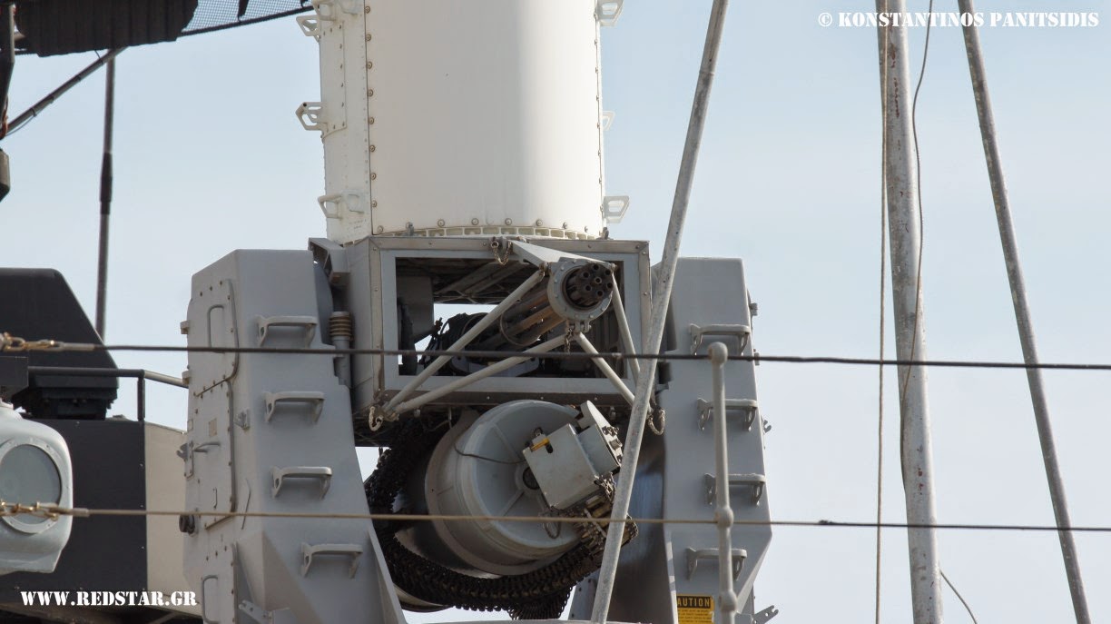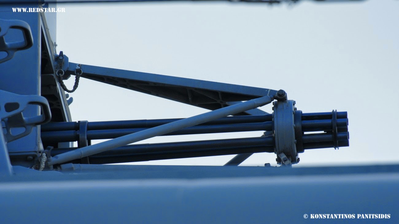 At the top of the helicopter hangar of Batch I and III vessels, a Raytheon Mk15 Phalanx Close-In-Weapon System (CIWS) is installed, a very popular system worldwide in this role. Phalanx is a rapid-fire, computer-controlled, radar-guided gun system designed to defeat anti-ship missiles and other close-in air and surface threats. As a self-contained package, Phalanx automatically carries out functions usually performed by multiple systems – including search, detection, threat evaluation, tracking, engagement, and kill assessment. The block that belongs the Phalanx of the Batch II and III ships, is the old Block 1, and thus the system lacks the stabilized Forward-Looking Infra-Red (FLIR) sensor, the automatic acquisition video tracker and the other improvements which have the newer models such as the Block 1B. The vessels of the Batch II are equipped with the Block 1A Baseline 0 models while some of the vessels of Batch I have an upgraded Block 1A Baseline 1 model similarly with the Hydra class frigates of Hellenic Navy. The Baseline 1 upgrade replaced the hydraulic gun drive with a pneumatic (air-driven) gun drive system that increased the rate of fire to 4,500 rounds per minute. Search radar sensitivity was also improved in the baseline 1 upgrade. The Batch III frigates received Block 0 systems from the retired Knox frigates; these models have been upgraded also to Block 1A standards. Block 1A incorporates a new High Order Language Computer (HOLC) in order to better process engagement algorithms and provided improved performance against maneuvering targets. . Phalanx has a 20 mm (0.79in) M61 Vulcan 6-barreled Gatling autocannon that has an effective range of more than 3.5km and a rate of fire of higher than 3,000 rounds (!) per minute with a magazine drum holding 1,550 rounds. The Block 0 held 989 rounds.