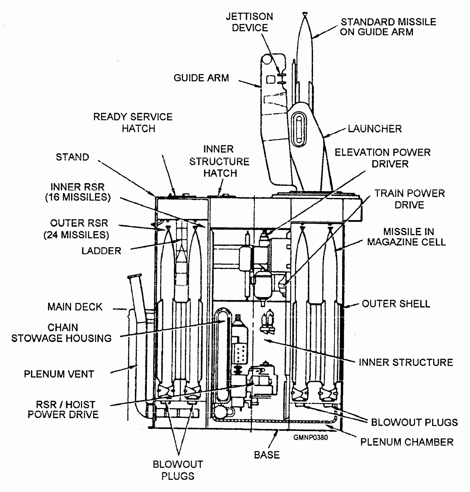 Conceived as air defence frigates, the primary anti-aircraft equipment, except the Sea Sparrow launcher, it is a single-arm Raytheon Tartar guided missile launching system (GMLS) Mk13 Mod 4 launcher for Standard SM-1MR (RIM-66E) surface-to-air missiles. The Mk 13 missile launcher replaced the helicopter hangar and deck of the Kortenaer class frigates. The launcher is capable of firing the Standard missile at a rate of one per eight seconds; the Mk 13 Mod 4 GMLS can stow up to 40 missiles (outer ring: 24; inner ring: 16). The SM-1MR has a speed of Mach 2.5 and a range of approximately 45km. The range is almost double for the SM-2MR, about 70-80km but Chilean Navy has not upgraded the sensors and the launcher to receive this variant. In addition