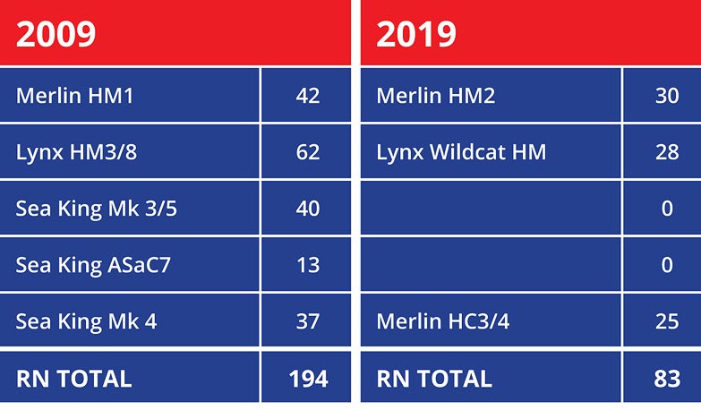 dramatically by 57% (from 194 to 83) in the decade between 2009 and 2019! It should be emphasized that Royal Navy lost completely the capability of long patrol missions with the retirement of all the Nimrod variants and the fail of the development and procurement plan of the Nimrod MRA4 aircrafts (the procurement plan was ultimately cancelled in 2010 as a result of the Strategic Defence and Security Review, at which point it was £789 million over-budget and over nine years late). Moreover, all the nine (9) constructed Nimrod MRA4 aircrafts were.. scrapped. The Public Accounts Committee concluded in February 2012 that the decision had been made without a proper understanding of the cost implications and had wasted £3.4bn! Fixed-wing carrier operations ceased in 2010 with the retirement of the last Harrier aircraft. HMS