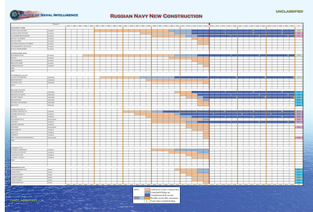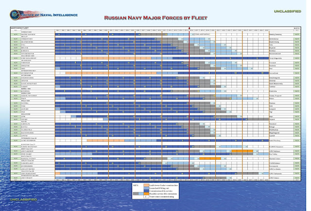 The U.S. Office of Naval Intelligence (ONI), published an excellent report accompanied by some very good graphs, about the current and future capabilities of Russia's maritime forces. ONI's most recent unclassified report on Russia's navy, The Russian Navy - A Historic Transition, looks historically and currently at the role played by Russian Naval forces. It is the first such report discussing the Russian Federation Navy by ONI since the seventh and last issue of Understanding Soviet Naval Developments published in 1991. The document is titled  "The PLA Navy: New Capabilities and Missions for the 21st Century", and you can read it here. Moreover, the U.S. Office of Naval Intelligence (ONI) is making available publicly two great tables, the one about the Russian Major Navy Forces by Fleet, Russian Major Navy Forces by Fleet (Continued) and Russian Navy New Constructions.
