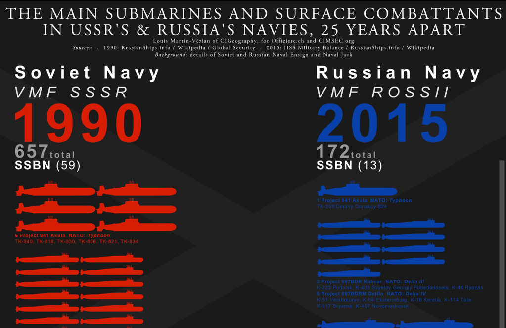 At the same time, Offiziere.ch published today an excellent article written by Patrick Truffer about The Development of Soviet/Russian Naval Capabilities after the Cold War. An awesome infographic by the blogger Louis Martin-Vézian of cigeography.blogspot.com shows the drastic reduction of the Soviet/Russian naval forces, with regard of the quantity of the available naval equipment, since the collapse of the Soviet Union.The image is really big! Enjoy this awesome graph (honestly, an insane work, high resolution image here) by Louis!