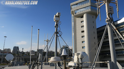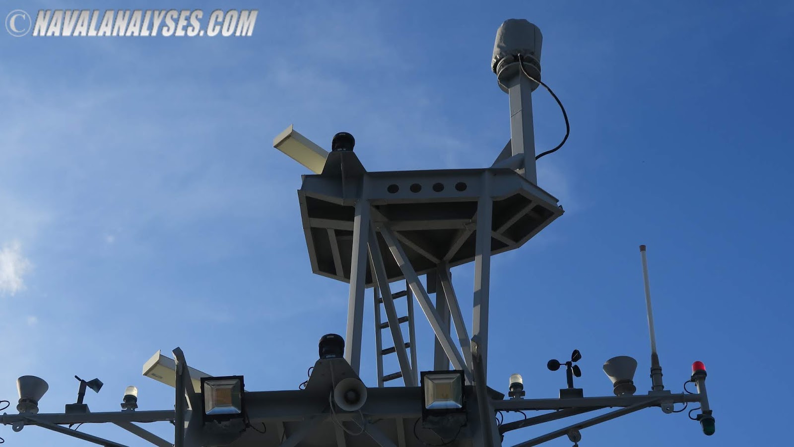 | The mast of the vessel with two Sperry Marine navigation radars and one TopLite electro-optical sensor. The old TopLite model will be replaced this year by a variant of the very advanced TDR-10 sensor produced by the Greek company Miltech Hellas. More here. Details of the new sensor will follow soon! |