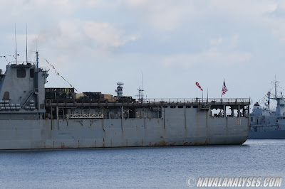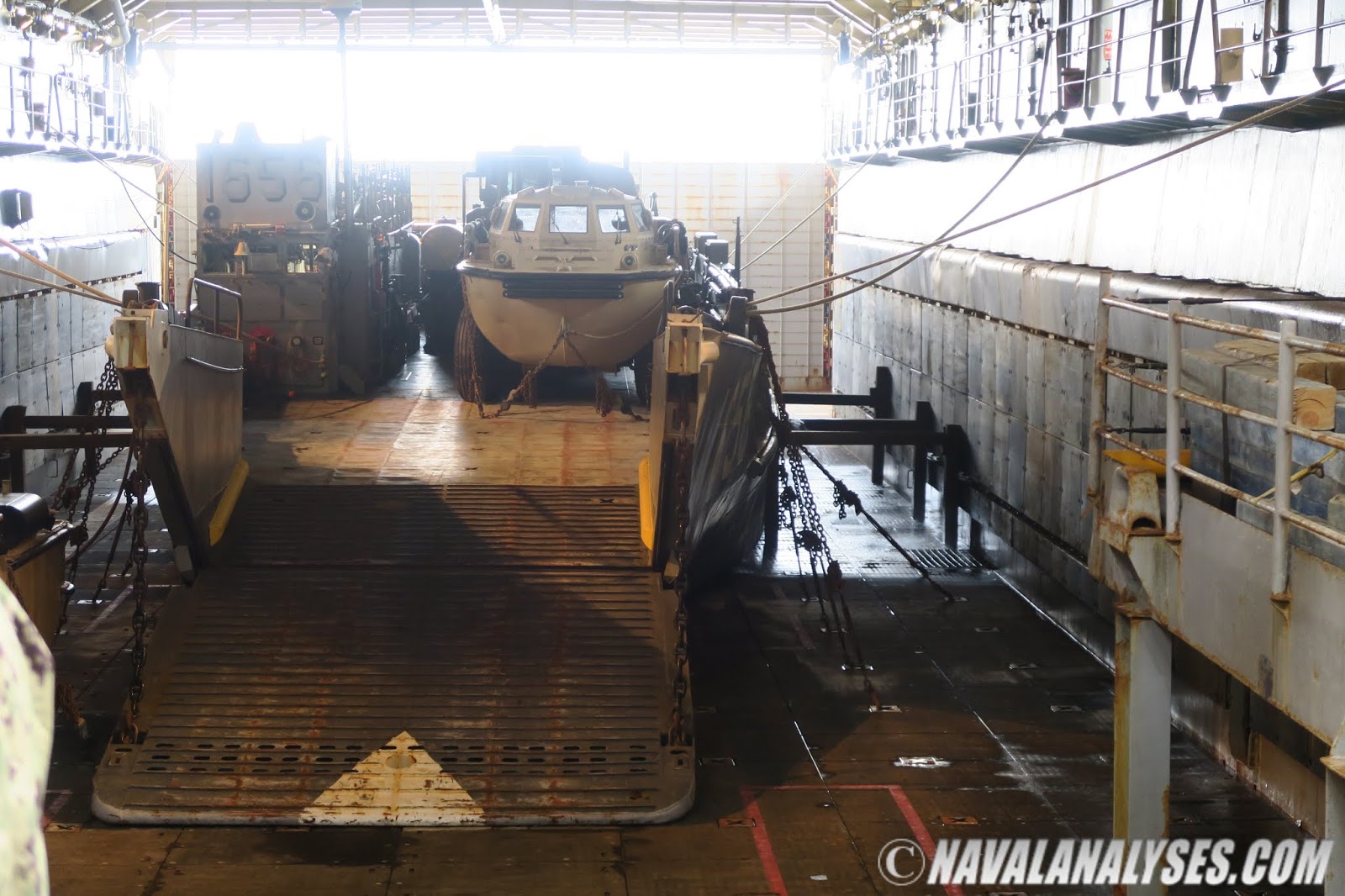 An USMC AAVC-7A1 forward of the well deck where a 41-meter LCU-1646 class carries one of the two LARC-Vs