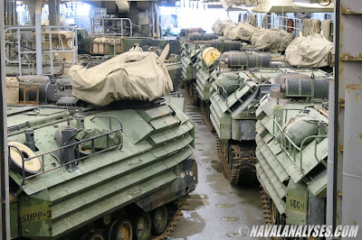 Numerous vehicles in the vehicle deck including M-1A1 MBTs and AAVP-7A1s