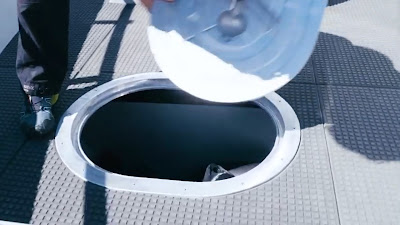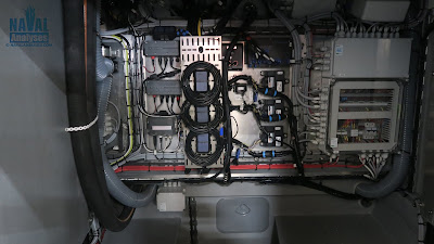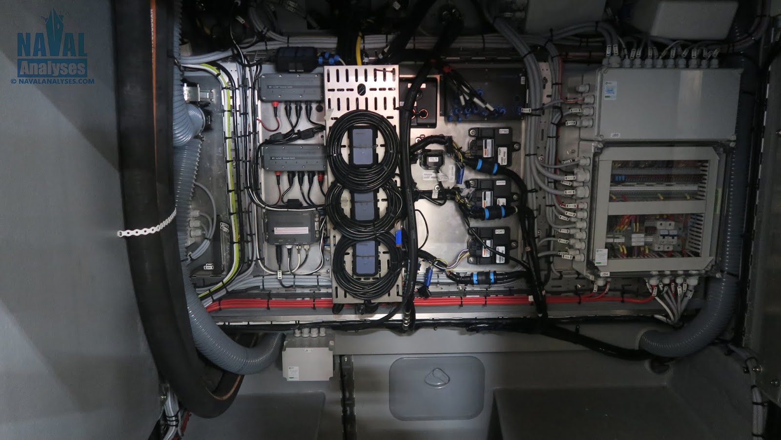 At the rear, behind the crew, is a multifunction workbench and storage lockers. Below the deck are the fuel tanks with 1,050l capacity. There’s also a 60l water tank with a pressurized system ready for a mister, and two automatic bilge pumps (along with a manual version for emergency backup). The maximum load capacity is enough for most duties, coming in at around 2,500kg: there are cargo rails on the deck for fixing storage boxes and other equipment so the vessel can be used for a variety of operations. The boat features also special hooks for helicopter lift. The quality of the construction material is quite impressive indeed!